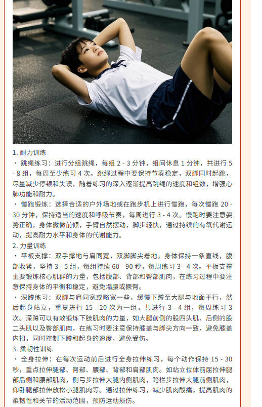 中学阶段则聚焦专业提升,以专项训练筑牢体质根基。连云港市新港中学的体育寒假作业聚焦足球、排球两大球类项目,通过专项练习强化学生球感与控球能力,夯实球类运动基础。同时搭配体能训练与跳绳练习,全面提升学生的力量、速度、耐力、灵敏性与柔韧性,为新学期的学习生活打牢体能基础,以系统化训练助力中学生体质稳步提升。此外,学校还专门推出强化耐力、力量和柔韧性在内的“体能作业”,包含“跳绳练习”“慢跑锻炼”“深蹲练习”“平板支撑”等。